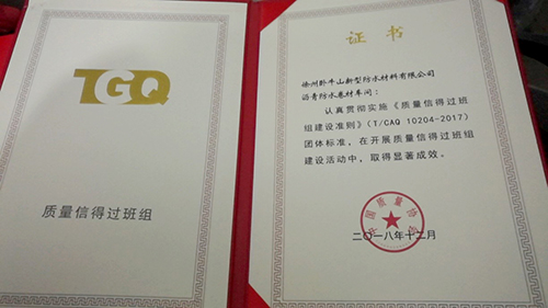 近日,依據(jù)《質(zhì)量信得過班組建設準則》,徐州臥牛山瀝青防水卷材車間獲評中國質(zhì)量協(xié)會2018年度“質(zhì)量信得過班組”稱號。