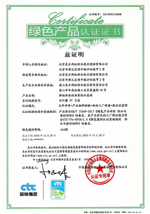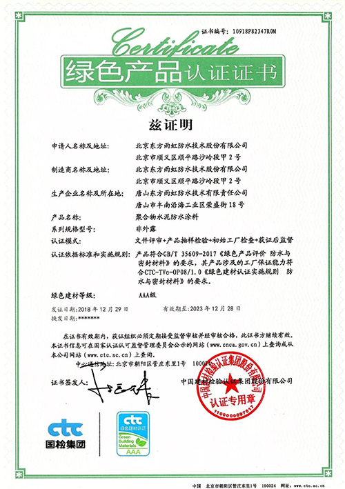 東方雨虹申報兩類產品獲“綠色產品認證”