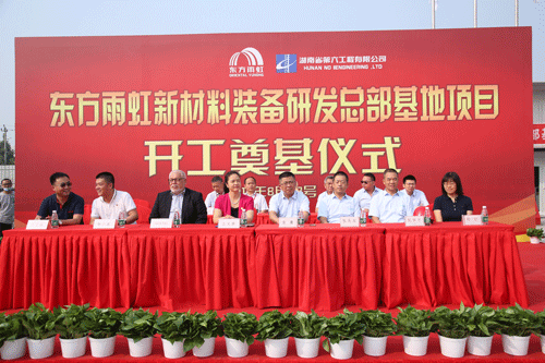 湖南省第六工程有限公司華北公司總經理袁鷹、原巴斯夫高級副總裁現東方雨虹特聘專家 Joachim Roser博士、東方雨虹新材料研發總部基地項目負責人楊小波、湖南省第六工程有限公司華北公司東方雨虹新材料研發總部基地項目負責人劉華平、中國建筑設計研究院有限公司設計主持人時紅等共同出席了此次開工奠基儀式。