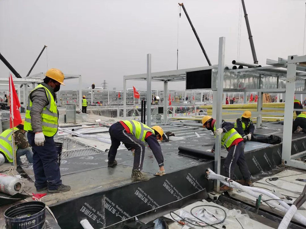 2月4日,根據該項目工程進度安排,東方雨虹的物資車輛與施工隊伍相繼抵達北京小湯山康復醫院項目施工現場后,立刻進行防水施工安排。東方雨虹主要負責屋面及屋面拼接縫的防水任務。