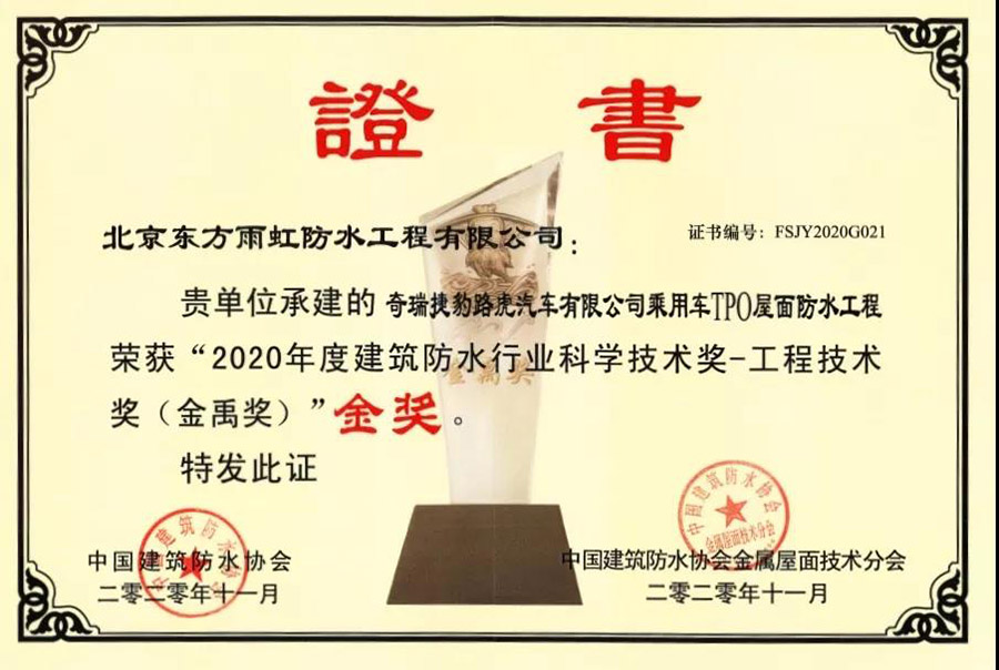 近日,中國建筑防水協(xié)會和《中國建筑防水》雜志社聯(lián)合在全行業(yè)開展了2020年度“建筑防水行業(yè)科學(xué)技術(shù)獎——工程技術(shù)獎(金禹獎)”評選活動。東方雨虹(ORIENTAL YUHONG)3項承建項目分別獲2020年度 “建筑防水行業(yè)科學(xué)技術(shù)獎——工程技術(shù)獎(金禹獎)”金獎,“建筑防水行業(yè)科學(xué)技術(shù)獎——工程技術(shù)獎(金屬圍護系統(tǒng)金禹獎)”金獎、銀獎。評選活動開展的7年間,東方雨虹(ORIENTAL YUHONG)已獲金獎11枚,銀獎6枚。